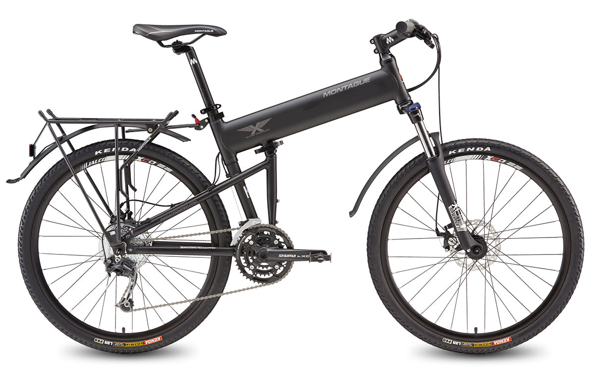Full sized folding bike that is compact to store and transport, yet folds out into a full-sized mountainbike. The Pro model features disc brakes and full travel front suspension.